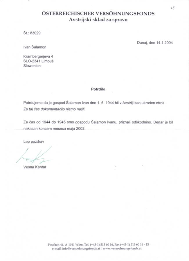 G. Ivan Šalamon se nikakor ni mogel sprijazniti z odločbami »svoje« države Republike Slovenije, še zlasti zato, ker je med tem iz Republike Avstrije prejel dopis, s katerim mu ta država, pravna naslednica nekdanjih okupatorjev, priznava status žrtve vojnega nasilja kot ukradenemu otroku. »Svoja« država mu tega ne priznava, tuja pa! Neverjetno!