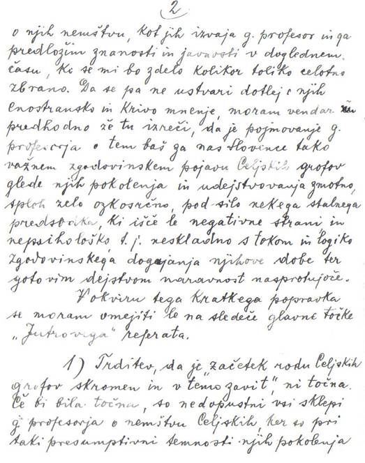 o njih nemštvu, kot jih izvaja g. profesor in ga predložim znanosti in javnosti v doglednem času, ko se mi bo zdelo kolikor toliko celotno zbrano. Da se pa ne ustvari dotlej o njih enostransko in krivo mnenje, moram vendar predhodno že tu izreči, da je pojmovanje g. profesorja o tem baš za nas Slovence tako važnem zgodovinskem pojavu Celjskih grofov glede njih pokolenja in udejstvovanja zmotno, sploh zelo ozkosrčno, pod silo nekega stalnega predsodka, ki išče le negativne strani in nepsihološko t.j. neskladno s tokom in logiko zgodovinskega dogajanja njihove dobe ter gotovim dejstvom naravnost nasprotujoče.